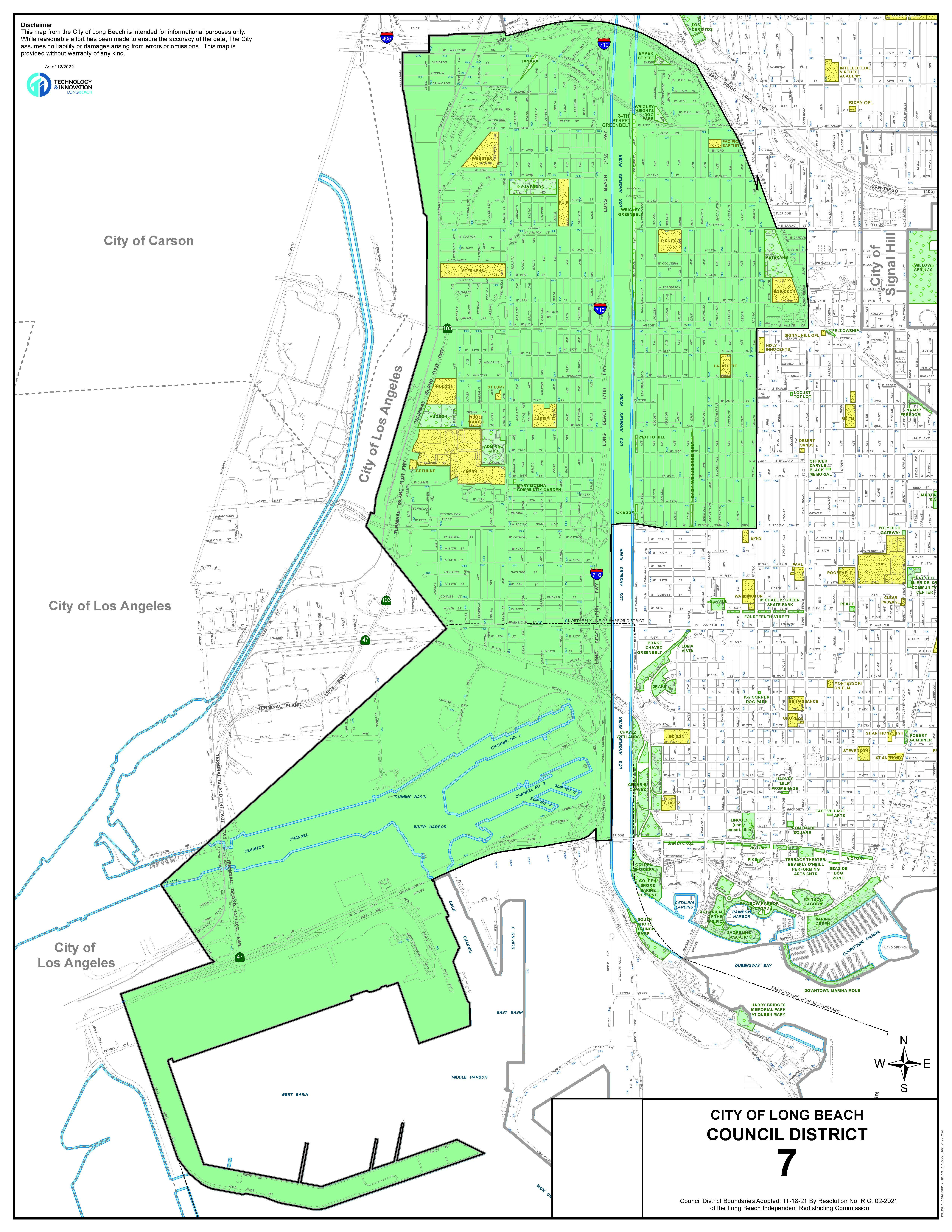 Long Beach City Council's 7th District includes the communities of Arlington, West Long Beach's Upper and Lower West Side, West Side Industrial Area, Windward Village, Wrigley Heights, North and South Wrigley, and includes the Port of Long Beach.