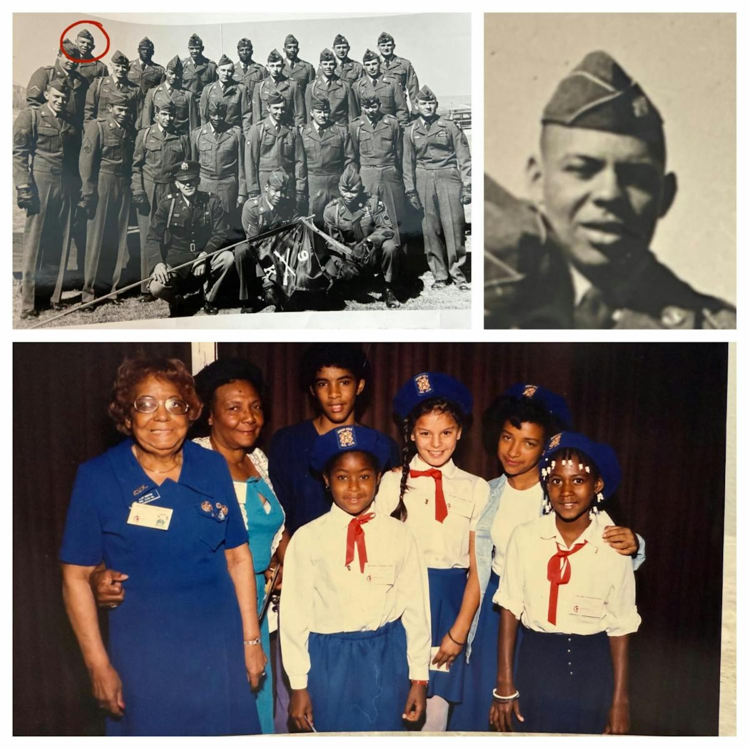 The top two photos are of my Dad and his army buddies. He is the first soldier on the left of the back row. The bottom photo is of my VFW troop in 1984 when I was 10 years old. Mrs. Polk is wearing the turquoise dress with the white sweater. I loved wearing that uniform with the blue beret!