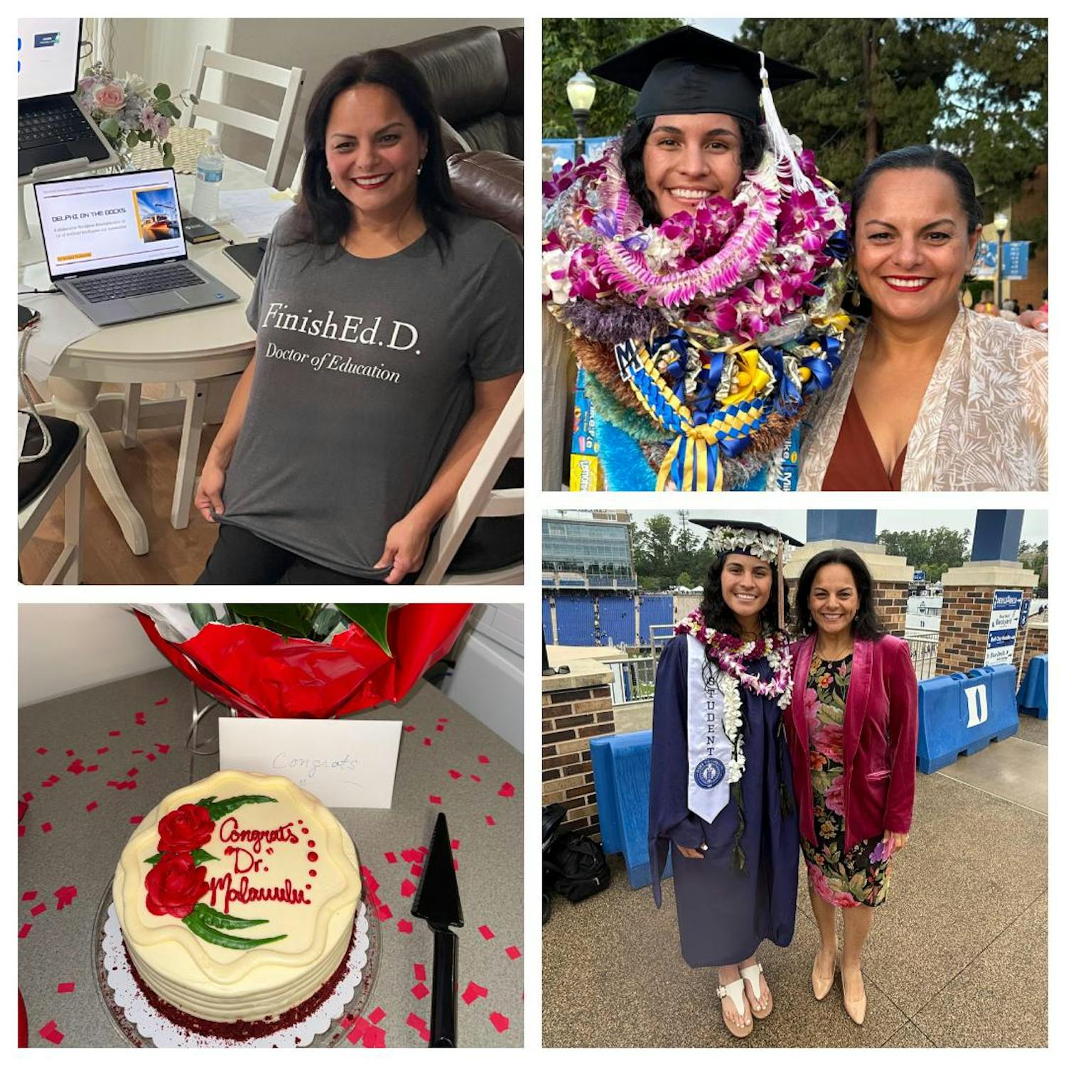 Here she is right after her defense on March 31st. The other two photos are from my undergraduate commencement at UCLA in 2024 and my master’s graduation at Duke in 2025. Some of her colleagues at LBCC surprised her with that cake.
